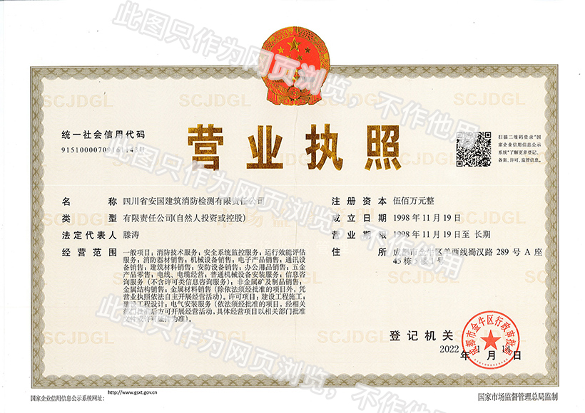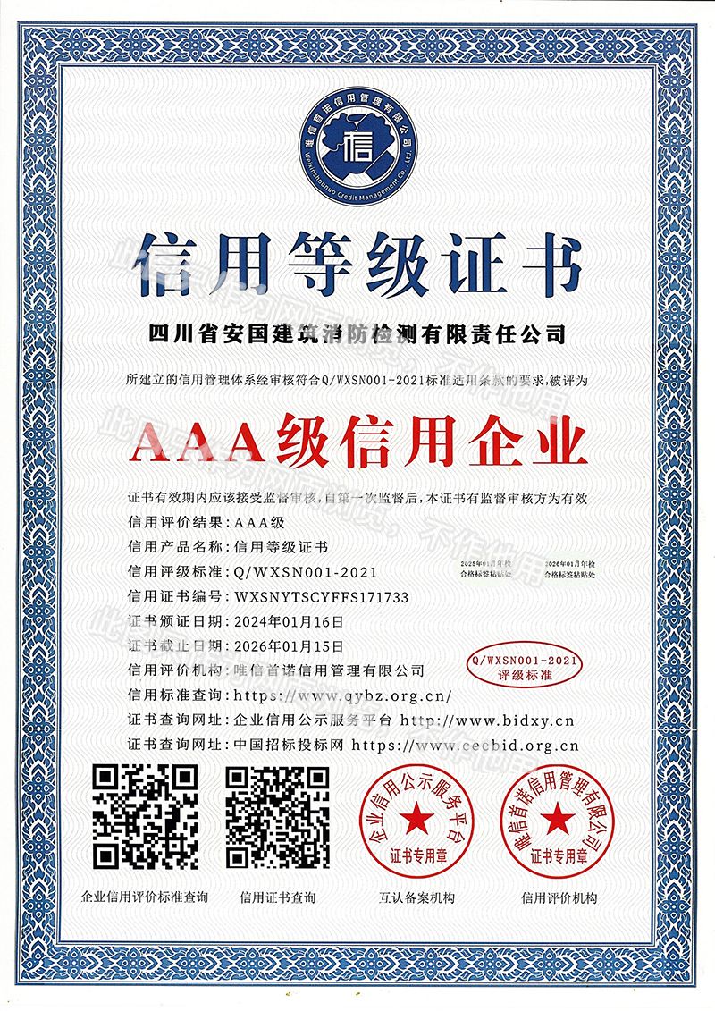 四川省安國(guó)建筑消防檢測(cè)有限責(zé)任公司,成立于1998年,經(jīng)四川省公安消防總隊(duì)批準(zhǔn),工商部門(mén)注冊(cè)的獨(dú)立法人單位。 公司具有建筑消防設(shè)施檢測(cè)、電氣防火安全檢測(cè)、維修、保養(yǎng)及技術(shù)咨詢(xún)一級(jí)資質(zhì)的中介技術(shù)服務(wù)機(jī)構(gòu),獲得CMA計(jì)量認(rèn)證。主要業(yè)務(wù)范圍是:接受建設(shè)單位或有關(guān)單位委托,承擔(dān)新建、改建、擴(kuò)建建筑自動(dòng)消防設(shè)施技術(shù)檢測(cè)、電氣防火安全檢測(cè)、以及承接建筑消防設(shè)施維護(hù)保養(yǎng),對(duì)已交付使用的建設(shè)消防設(shè)施的運(yùn)行情況進(jìn)行運(yùn)行檢測(cè),開(kāi)展建筑消防設(shè)施的消防安全技術(shù)咨詢(xún)。公司設(shè)辦公室、總工辦、財(cái)務(wù)部、檢測(cè)部、維保部等職能機(jī)構(gòu),擁有一